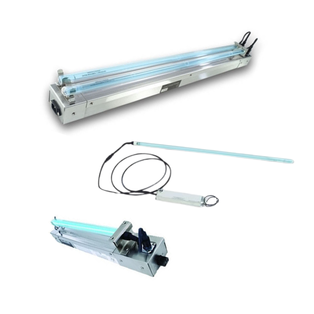 American Ultraviolet High-output DC Series HVAC UVC germicidal fixtures can be mounted in various configurations for optimum pass-by air decontamination and/or to irradiate cooling coils and drain pans. Lamps and electronics can be accessed from outside the duct or plenum. “Green” lamps (contain 28mg of mercury) extend inside to span supply ducts and/or cooling coils.